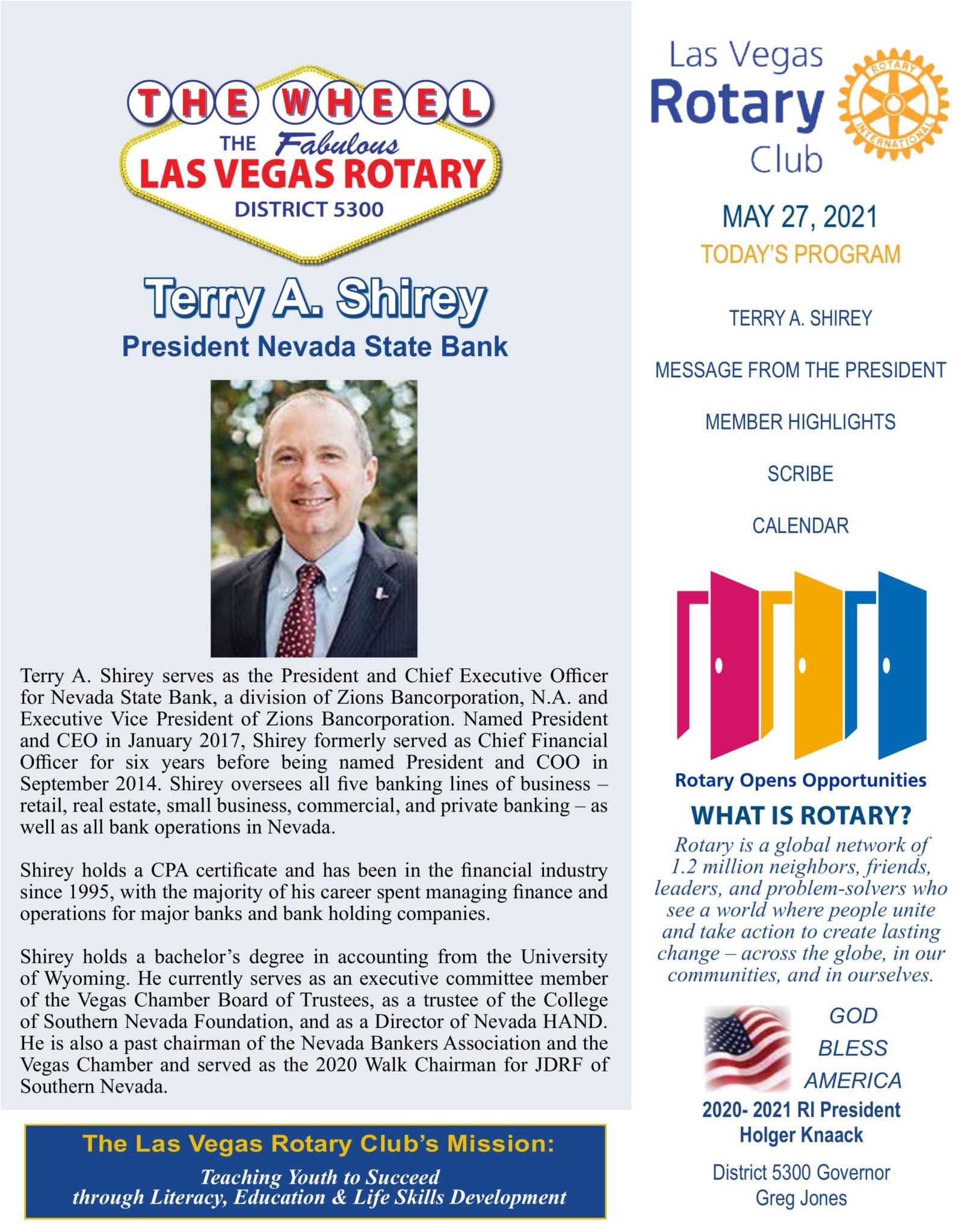 Shirey holds a bachelor’s degree in accounting from the University of Wyoming. He currently serves as an executive committee member of the Vegas Chamber Board of Trustees, as a trustee of the College of Southern Nevada Foundation, and as a Director of Nevada HAND. He is also a past chairman of the Nevada Bankers Association and the Vegas Chamber and served as the 2020 Walk Chairman for JDRF of Southern Nevada