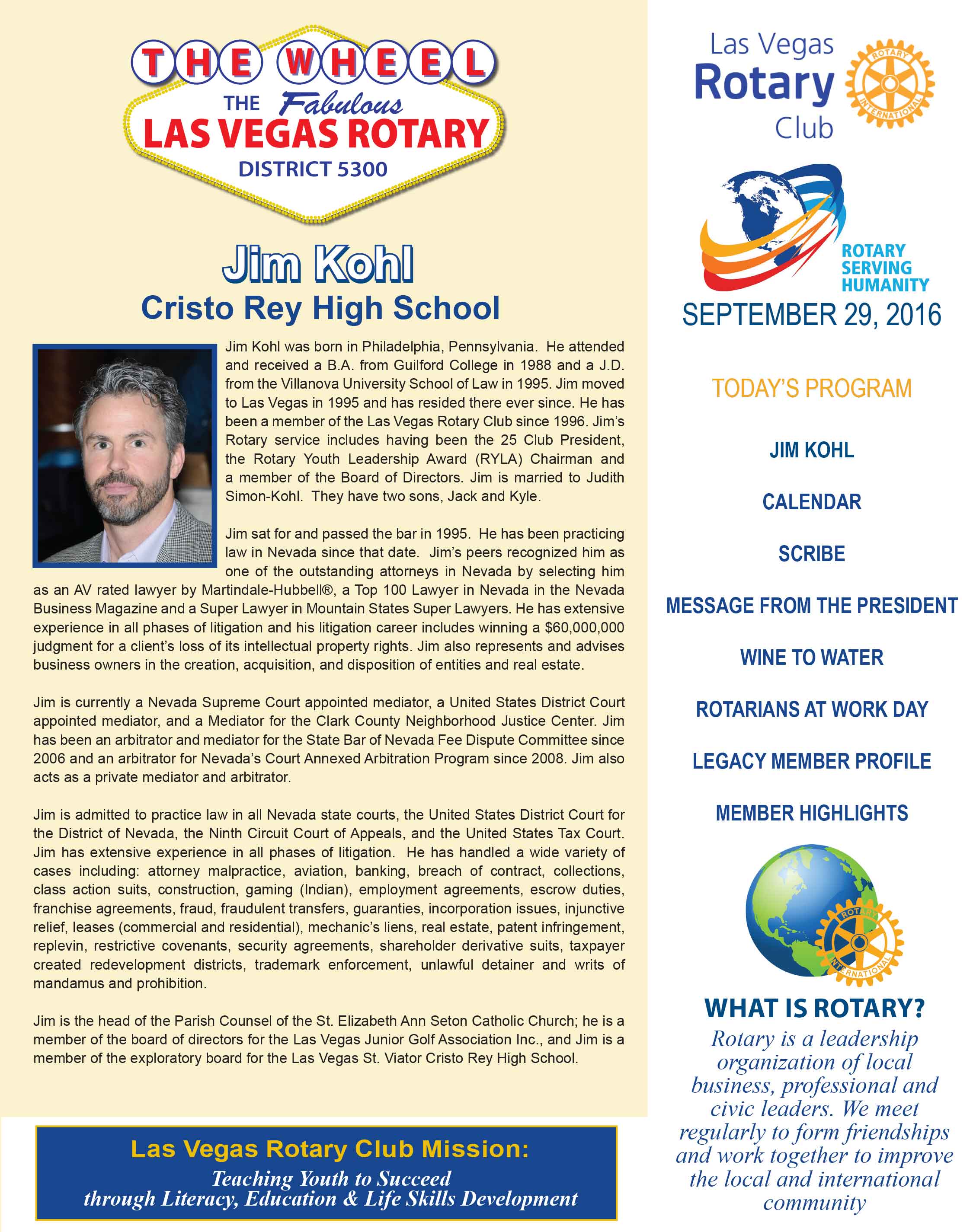 One of the true gifts of being a member of Rotary in general, and the Las Vegas Rotary Club in particular, is the character and quality of the people in our group. Member Jim Kohl is our speaker today. You can read his bio on the front cover of today’s Wheel and see the impressive list of accomplishments both in service to our club and professionally. I know we all see and appreciate the very generous financial contributions his firm makes through our club to a wide range of charities throughout the year as well.
