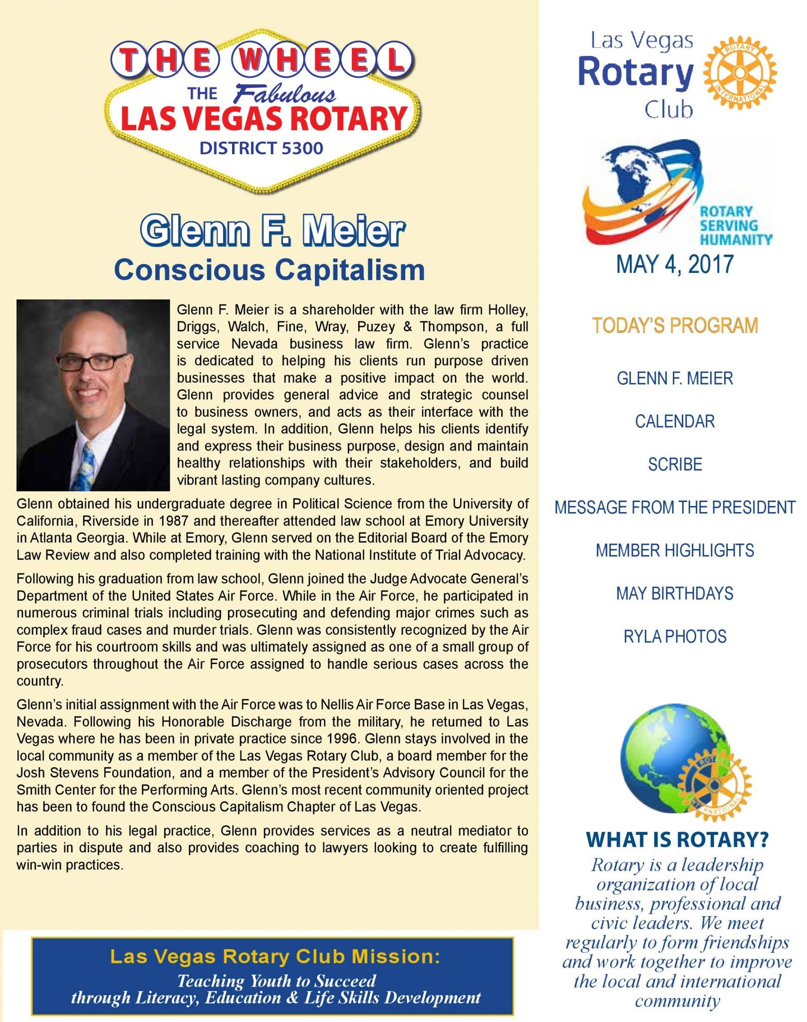 - Deb Granda announced that District conference is May 19-21, 2017. You may purchase a shirt for $30 – $7 of which will go to our Las Vegas Rotary Foundation.