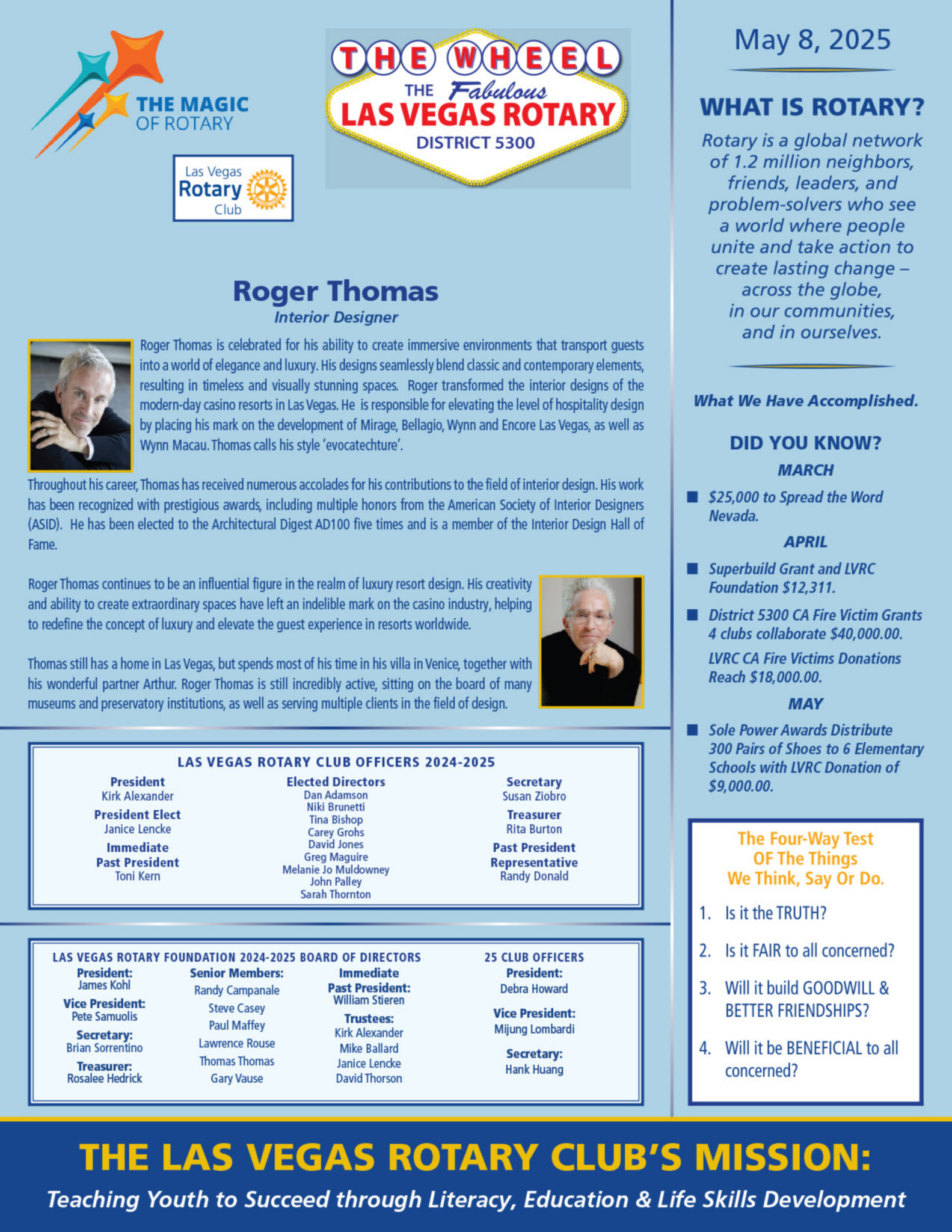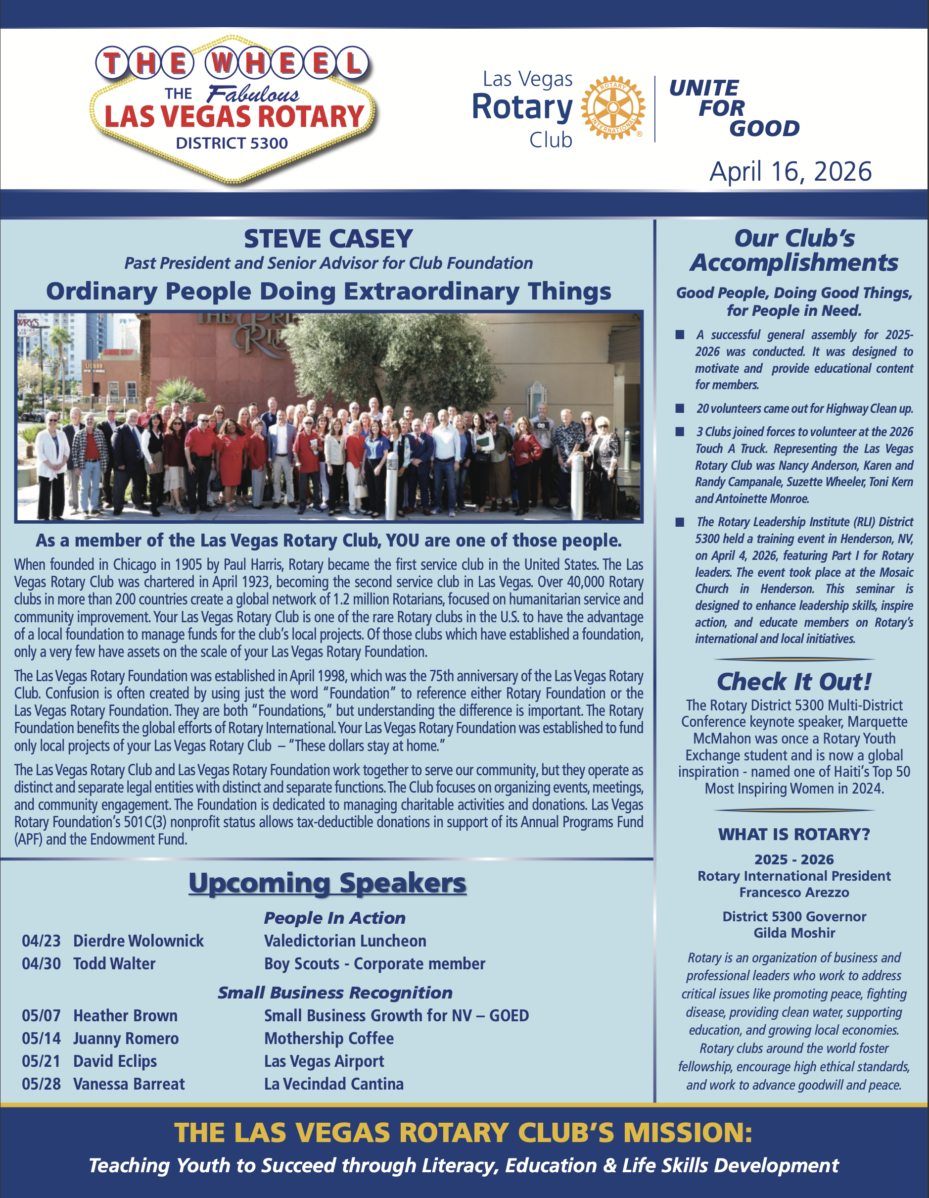 The Las Vegas Rotary Foundation, Inc., is an IRC 501 (c) (3) non-profit organization that raises and manages funds for the benefit of the community in which it resides, Rotary District 5300, national, and international programs determined to be beneficial by the Foundation. The Foundation exists to provide an environment for the achievement of the Foundation’s mission objectives through Club projects.