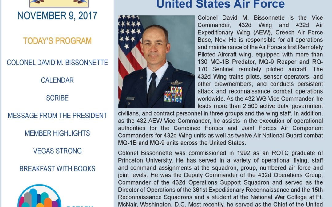 Listen To Colonel David M. Bissonnette – United States Air Force https://www.lasvegasrotary.com/wp-content/uploads/2017/11/20171109-las-vegas-rotary-club-speaker.mp3Podcast: Play in new window | DownloadSubscribe: Android | RSS The Wheel Download Colonel David...