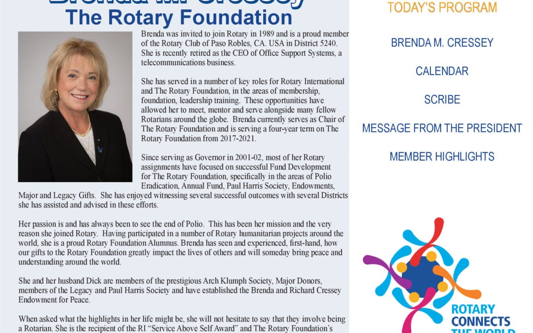 Listen to Brenda Cressey – The Rotary Foundation The Wheel Download Brenda Cressey – The Rotary Foundation Brenda was invited to join Rotary in 1989 and is a proud member of the Rotary Club of Paso Robles, CA. USA in District 5240. She is recently retired...