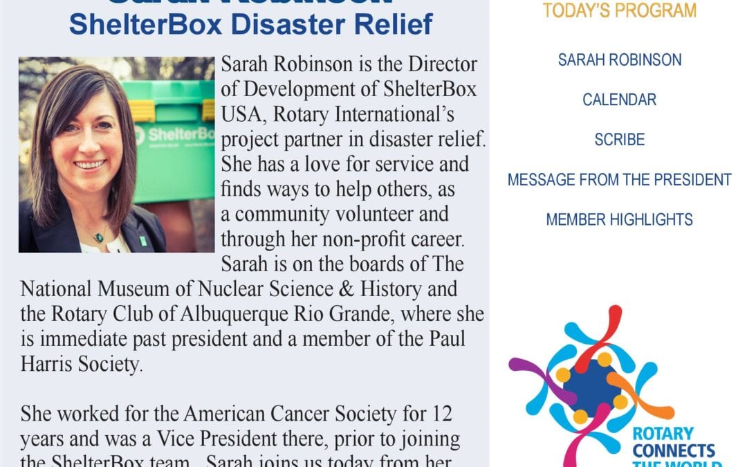 Listen to Sarah Robinson – ShelterBox USA The Wheel Download Sarah Robinson – ShelterBox USA Sarah Robinson is the Director of Development of ShelterBox USA, Rotary International’s project partner in disaster relief. She has a love for service and finds...