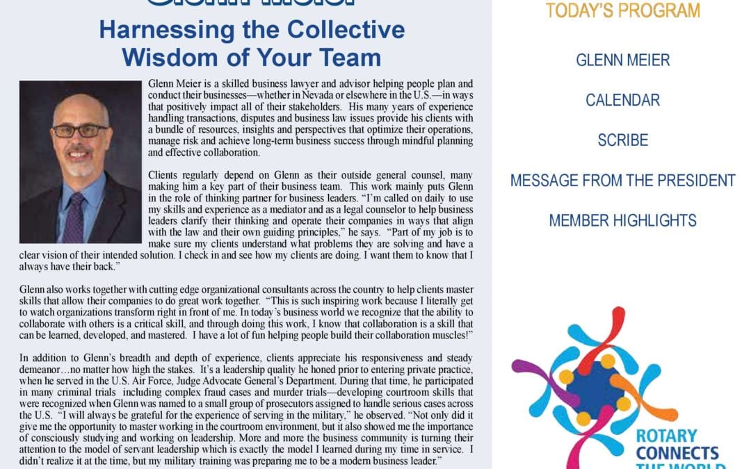 The Wheel for November 7, 2019 The Wheel Download Glenn Meier – Harnessing the Collective Wisdom of Your Team Glenn Meier is a skilled business lawyer and advisor helping people plan and conduct their businesses whether in Nevada or elsewhere in the U.S. in...