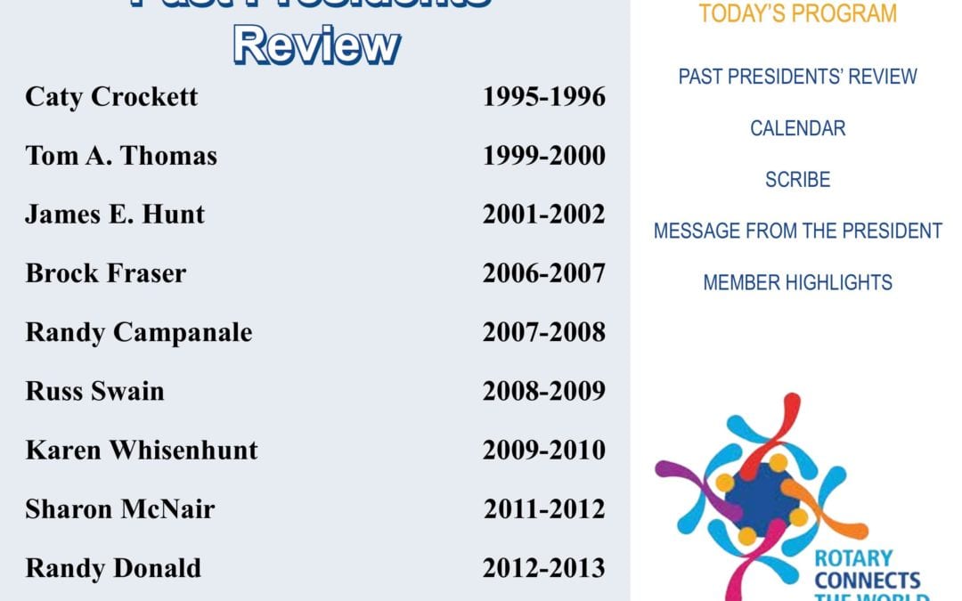The Wheel for February 20, 2020 Listen to Past President’s Review The Wheel Download Past Presidents’ Review Caty Crockett 1995-1996 Tom A. Thomas 1999-2000 James E. Hunt 2001-2002 Brock Fraser 2006-2007 Randy Campanale 2007-2008 Russ Swain 2008-2009 Karen...