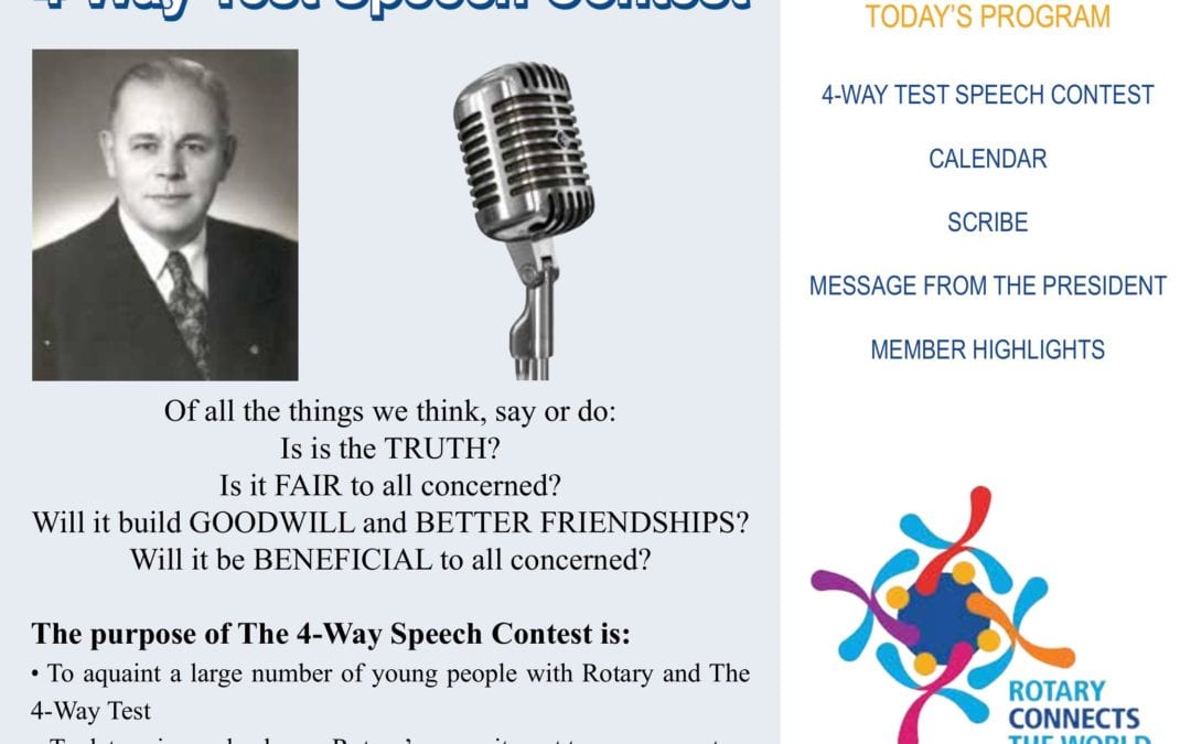 The Wheel for February 27, 2020 The Wheel Download 4-Way Test Speech Contest Of all the things we think, say or do: Is is the TRUTH? Is it FAIR to all concerned? Will it build GOODWILL and BETTER FRIENDSHIPS? Will it be...