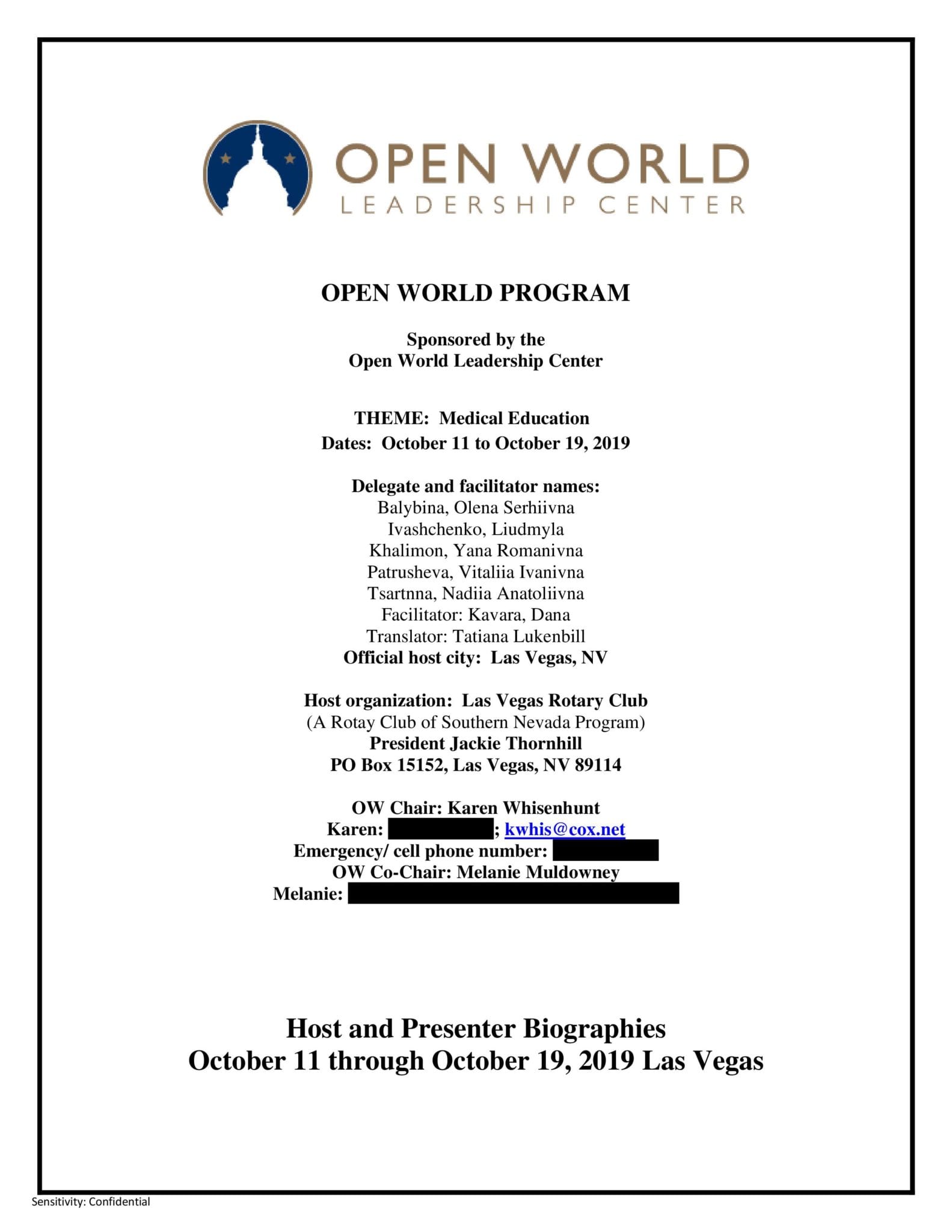The open world program was established in 1999 to expose emerging Russian political and civic leaders to American civil society through study visits to communities across the United States. Open world is the only program in the legislative branch and in December 2000 congress authorized the new and permanent Open World leadership center at the library of congress.