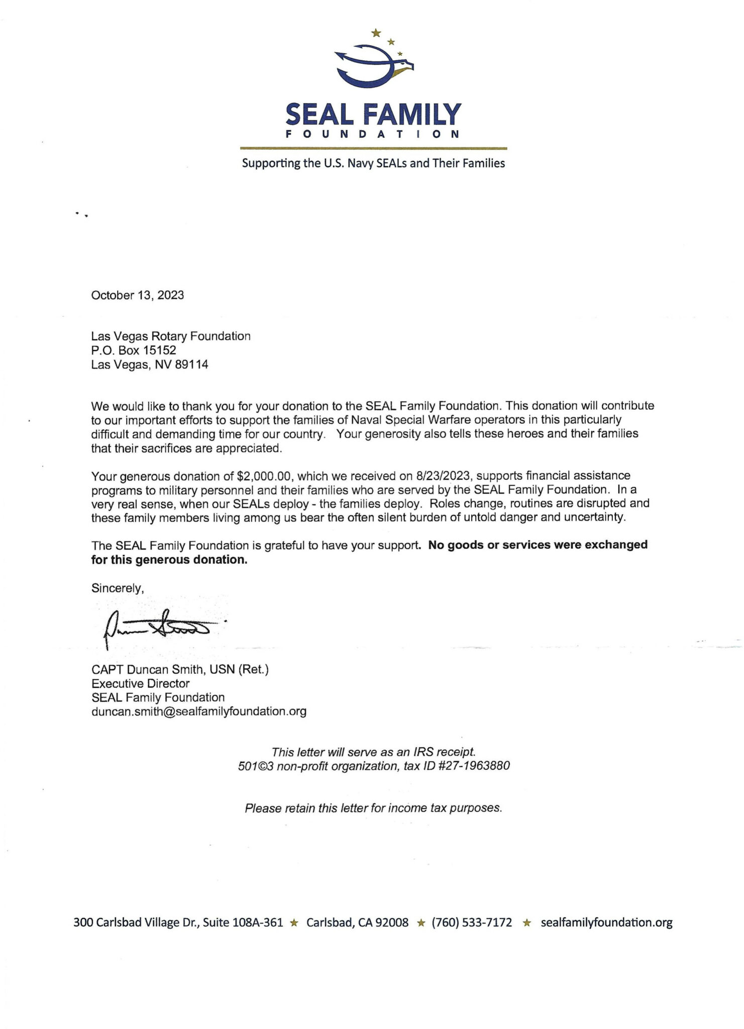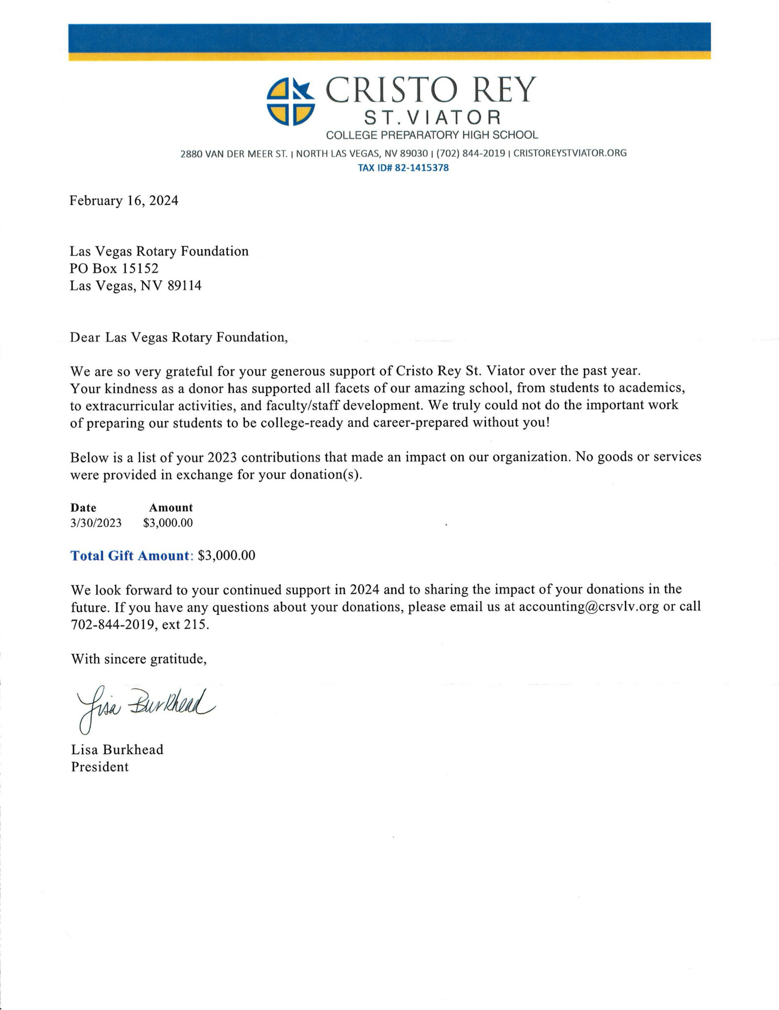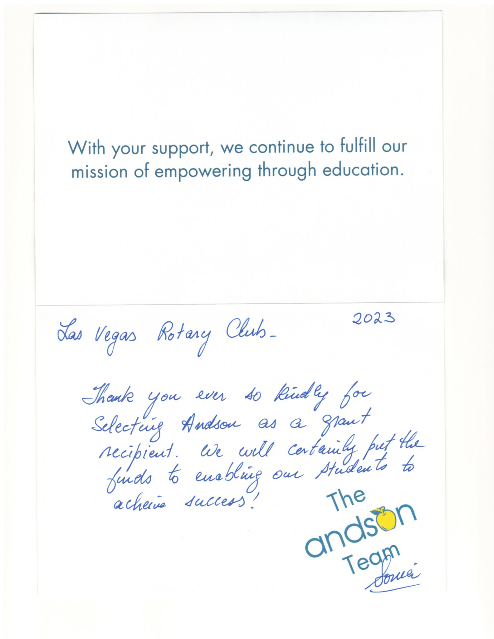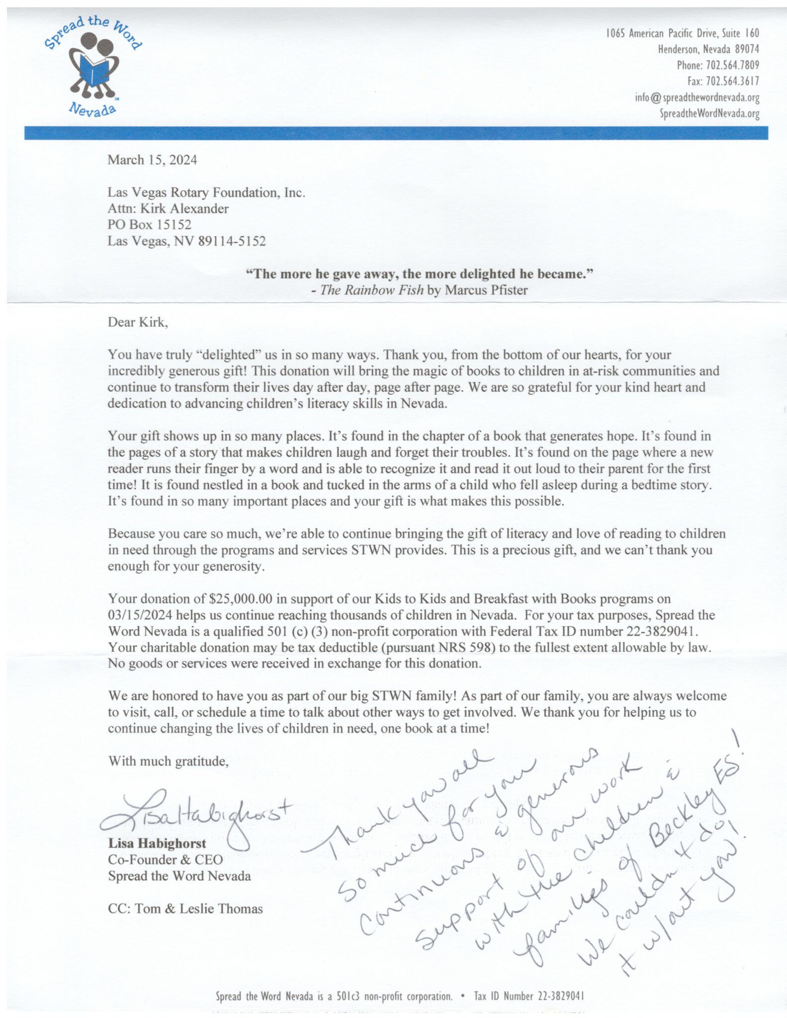 The Las Vegas Rotary Foundation, Inc. (“LVRF”) is registered with the Nevada Secretary of State and qualified by the Internal Revenue Services as a 501(c)(3) nonprofit organization (EIN: 88-0403571). Established in 1998, LVRF supports the Las Vegas Rotary Club. Las Vegas Rotary’s mission is “teaching youth to succeed through literacy, education & life skills development.” Your charitable contribution to LVRF is tax-deductible to the extent allowed by law.