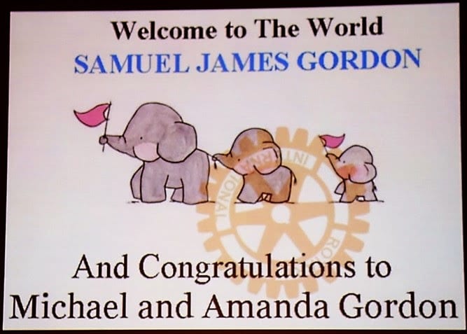 - PP Karen Whisenhunt announced the Putting Tournament on May 6th at Angel Park and awarded a prize to Luci Parodi for guessing the vital statistics and birth of President Michael and First Lady Amanda Gordon’s son Samuel James Gordon. Congratulations to the sleep deprived, but entertained parents!