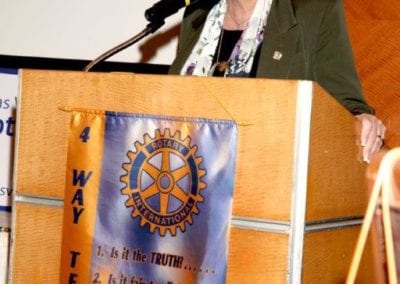 - President Michael presented the Four Way Test coin to Arleen Sirois for her involvement in many sustainability projects.