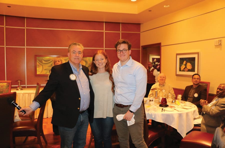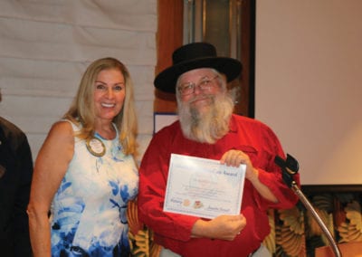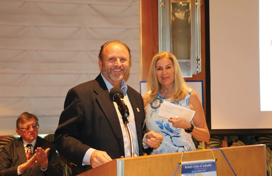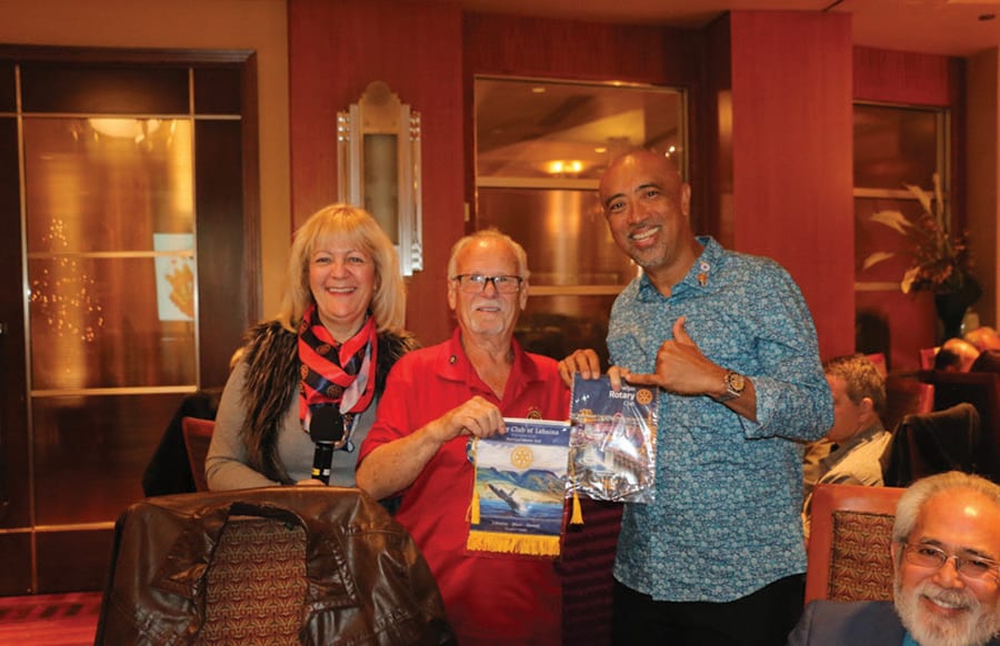 Sergeant at Arms Rose Falcoco joins Bob Werner in exchanging banners with our guest from Lahaina, Hawaii.