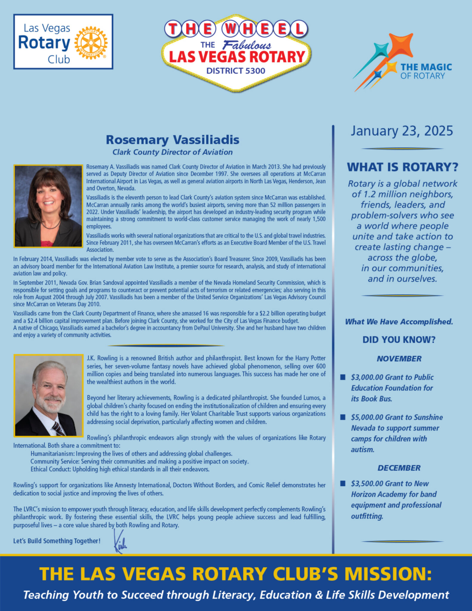 The Wheel for January 23, 2025 by Las Vegas Rotary ClubJan 23, 2025The Wheel0 comments The Wheel Download ← Previous Week Following Week → Submit a Comment Cancel replyYour email address will not be published. Required fields are marked *Comment * Name * Email * Website
