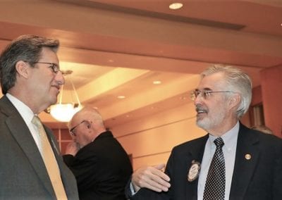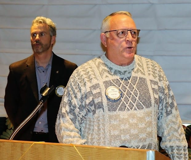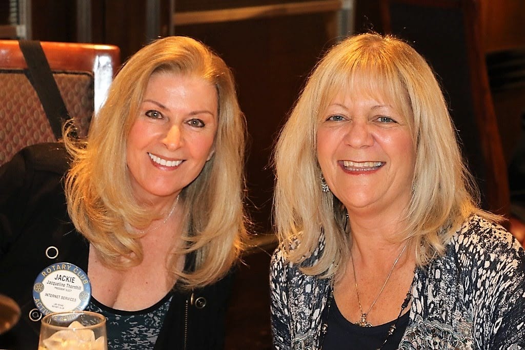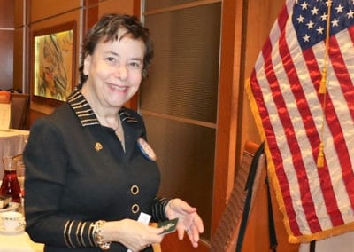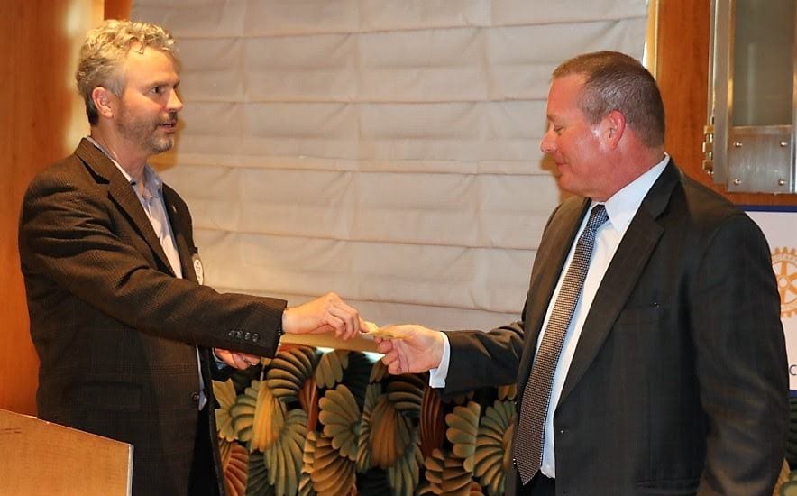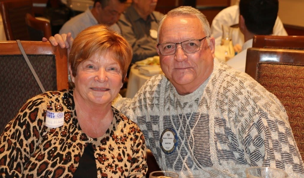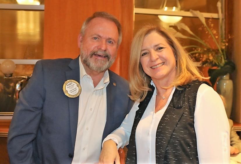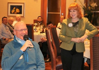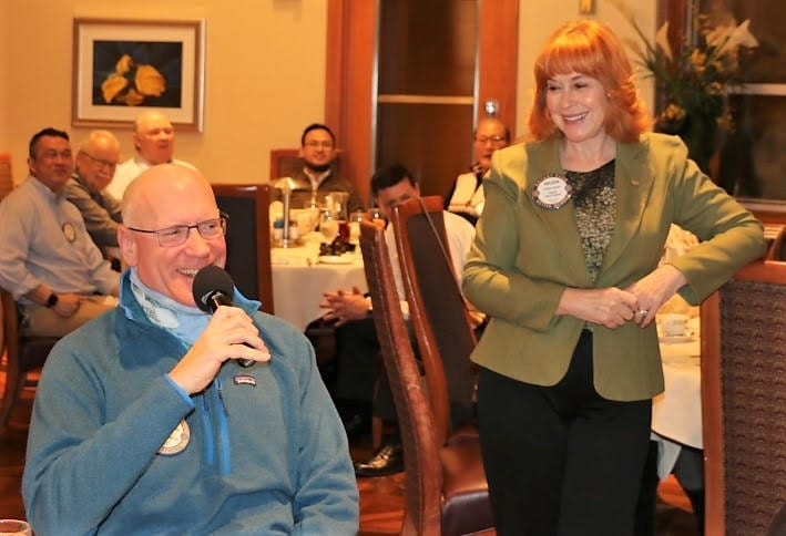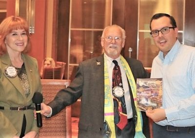 Sargent At Arms Arleen Sirois and Bob Werner present our visiting International Rotarian with our banner.