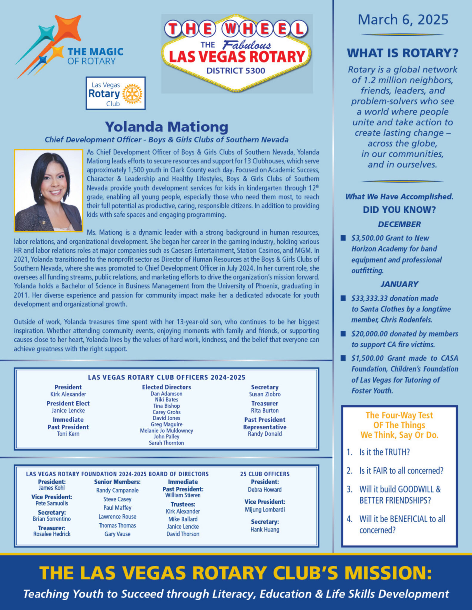 The Wheel for March 6, 2025 by Las Vegas Rotary ClubMar 13, 2025The Wheel0 comments The Wheel Download ← Previous Week Following Week → Submit a Comment Cancel replyYour email address will not be published. Required fields are marked *Comment * Name * Email * Website