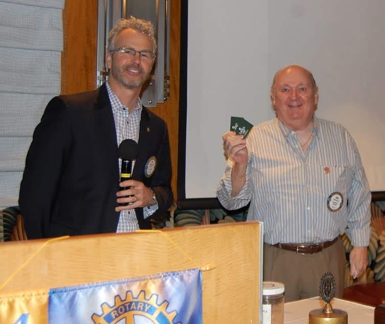 - President Jim called on Glenn Meier to discuss his recently published law article, and for being an unpaid author he would make a $200 donation; then PP Randy Donald explained his experience at the Kentucky Derby with Sally Donald, and as PP Randy had won some money his fine was $400; PP Tom Krob, who along with his wife Jane was at the Kentucky Derby with the Donalds, also had won some money and his fine was $200; Joakim Nyoni explained the picture that PP Steve Linder had taken of him at the District Conference, Joakim saying that he couldn’t keep up with PP Steve and Janet Linder’s partying during a cigar social late night, and so he was selected to make a $200 donation;