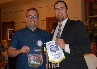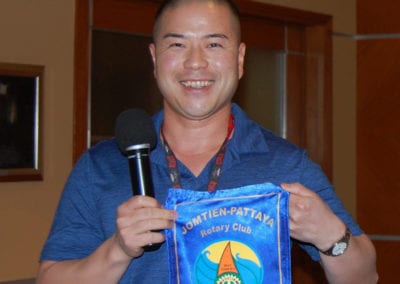 - Chan Lam presented the Jomtien-Pattaya RC banner he brought back from visiting them in Thailand; visiting Rotarian Gavin Brown of the RC of Somerset, U.K., and PP Michael Gordon exchanged banners;