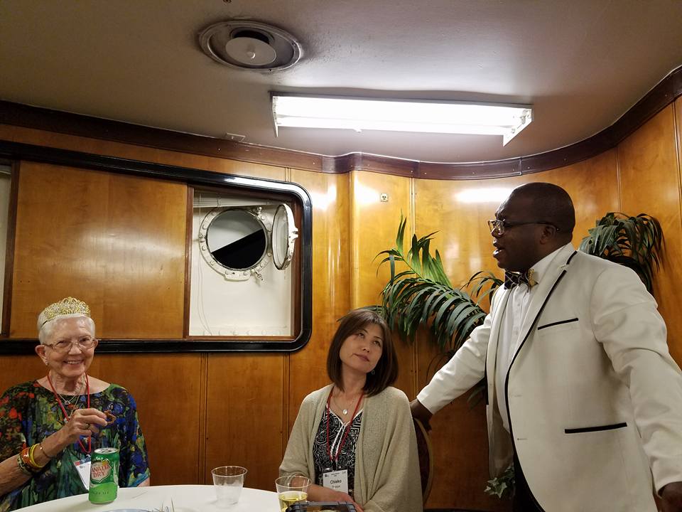Jerry Engel divided us with song. One side of the room singing “God Bless America” and one side with “America the Beautiful”.