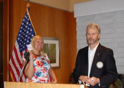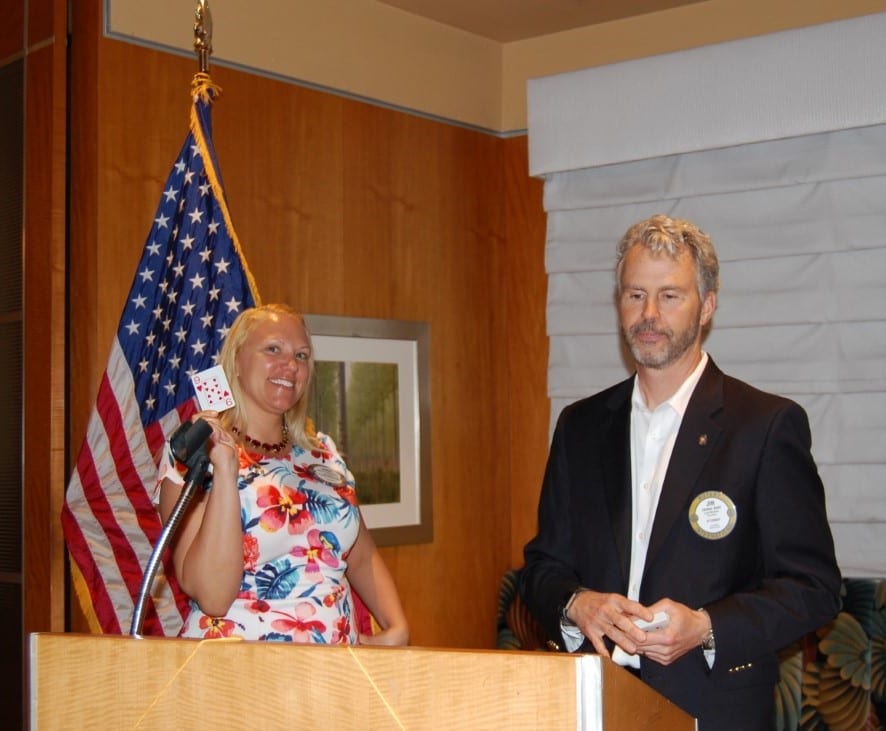 - Janice Lencke recognized the Annual Fundraiser Committee members who made Cuisine & Octane a success, and next week will provide the final numbers from that fundraising; Janice gave special recognition to AE&ES owner Gary Bordman, and owner Walter Carnwright and Lani Lopez of AGR (Amusement Game Rentals), these two companies provided over $12,000 worth of product to our event; Walter then gave President Jim a check as an additional contribution to our fundraising;
