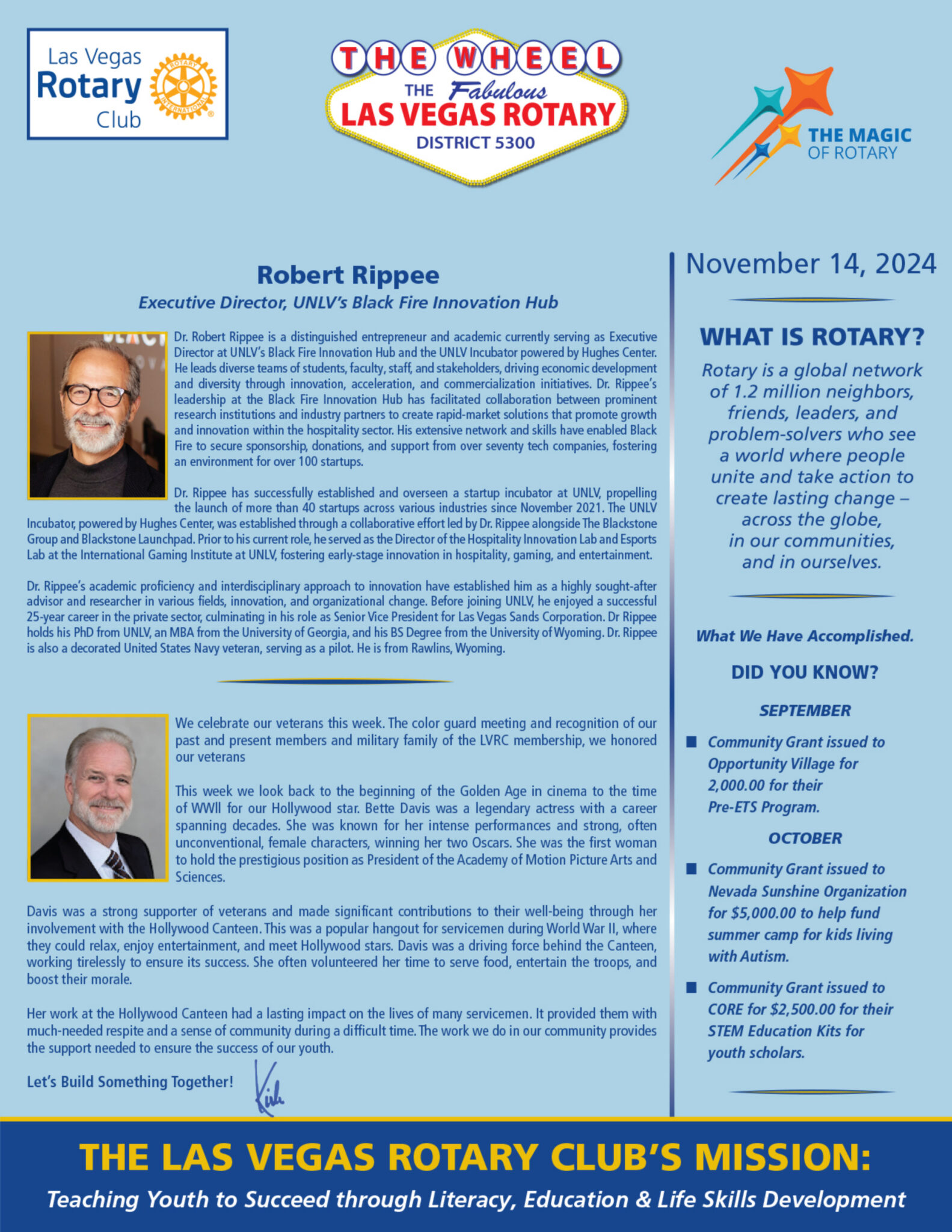 The Wheel for November 17, 2024 by Las Vegas Rotary ClubNov 14, 2024The Wheel0 comments The Wheel Download ← Previous Week Following Week → Submit a Comment Cancel replyYour email address will not be published. Required fields are marked *Comment * Name * Email * Website