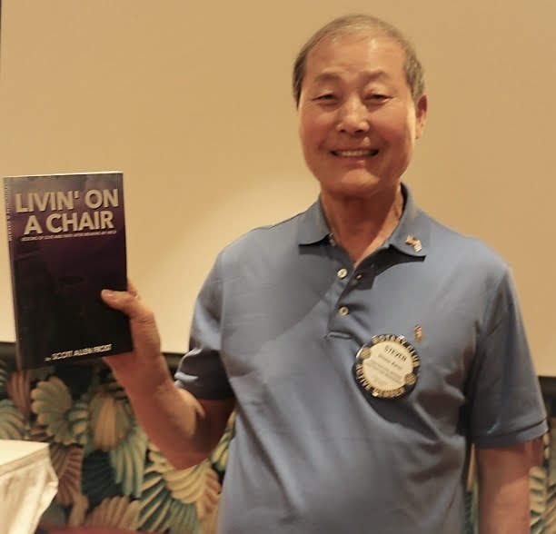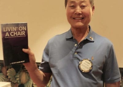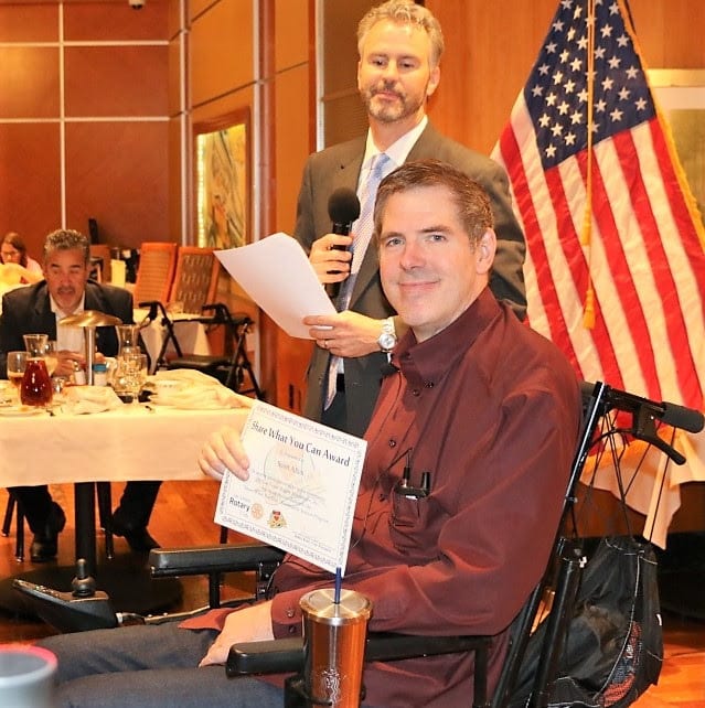 - Randy Frost introduced our program speaker, his son, Scott Allen Frost, who provided an incredible presentation of life, hope, faith and determination, describing the day in 2009 when, on a whim, he went dirt bike riding with his friend, and his life as he knew it changed him and his world forever. The journey traveled by Mr. Frost was described in poignant detail, including bits of humor and determined organization, from his rescue from the accident site, to his hospitalization and rehabilitation, to his lessons learned, clearly made his audience reflect and provide inspirational insight. The 5 lessons learned, (1) nobody wants to take care of or work for ‘a jerk’; (2) be the hope; (3) that things don’t happen to you, but rather for you; (4) don’t listen to ‘they’; and (5) the two things you can control; your effort and your attitude are words to live by resonated with everyone in the room
