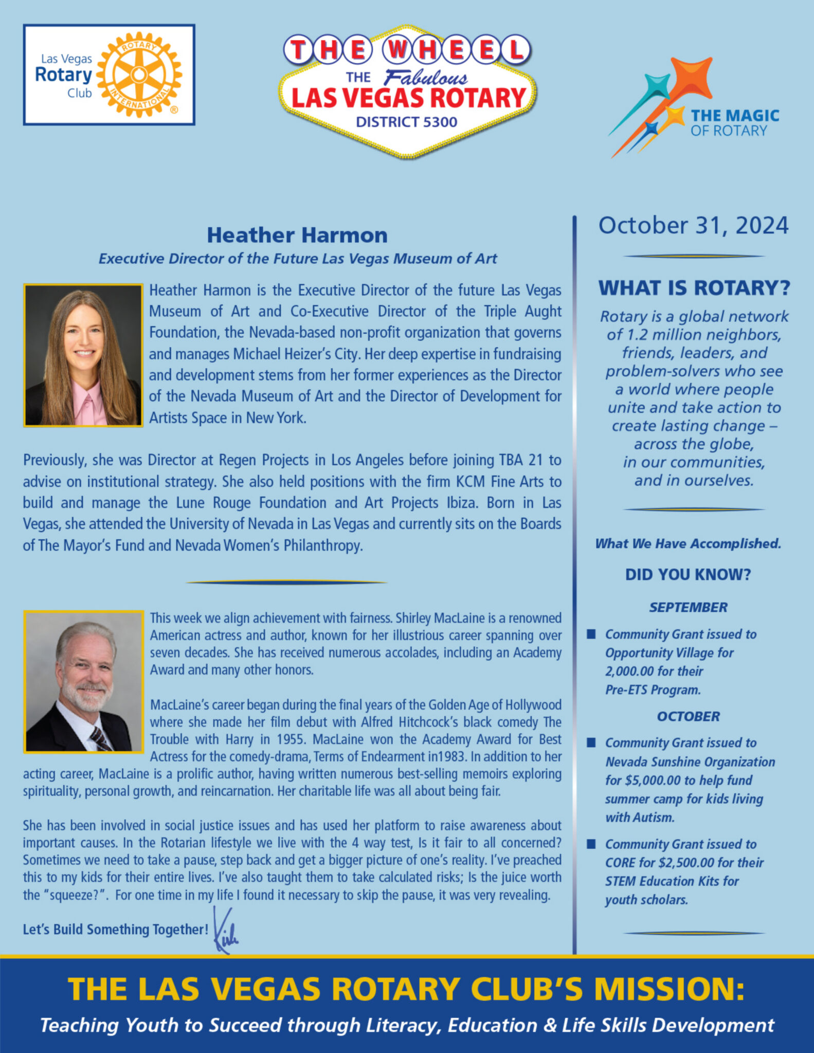 The Wheel for October 31, 2024 by Las Vegas Rotary ClubOct 31, 2024The Wheel0 comments The Wheel Download ← Previous Week Following Week → Submit a Comment Cancel replyYour email address will not be published. Required fields are marked *Comment * Name * Email * Website
