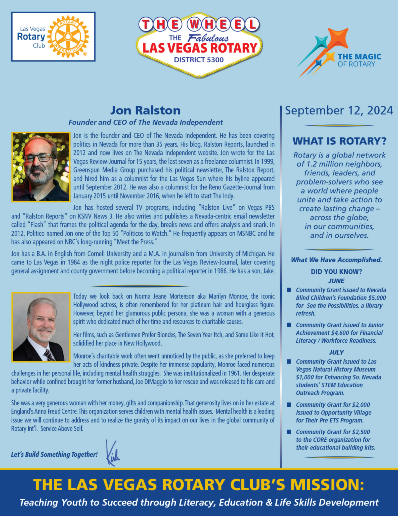The Wheel for September 12, 2024 by Las Vegas Rotary ClubSep 12, 2024The Wheel0 comments The Wheel Download ← Previous Week Following Week → Submit a Comment Cancel replyYour email address will not be published. Required fields are marked *Comment * Name * Email * Website