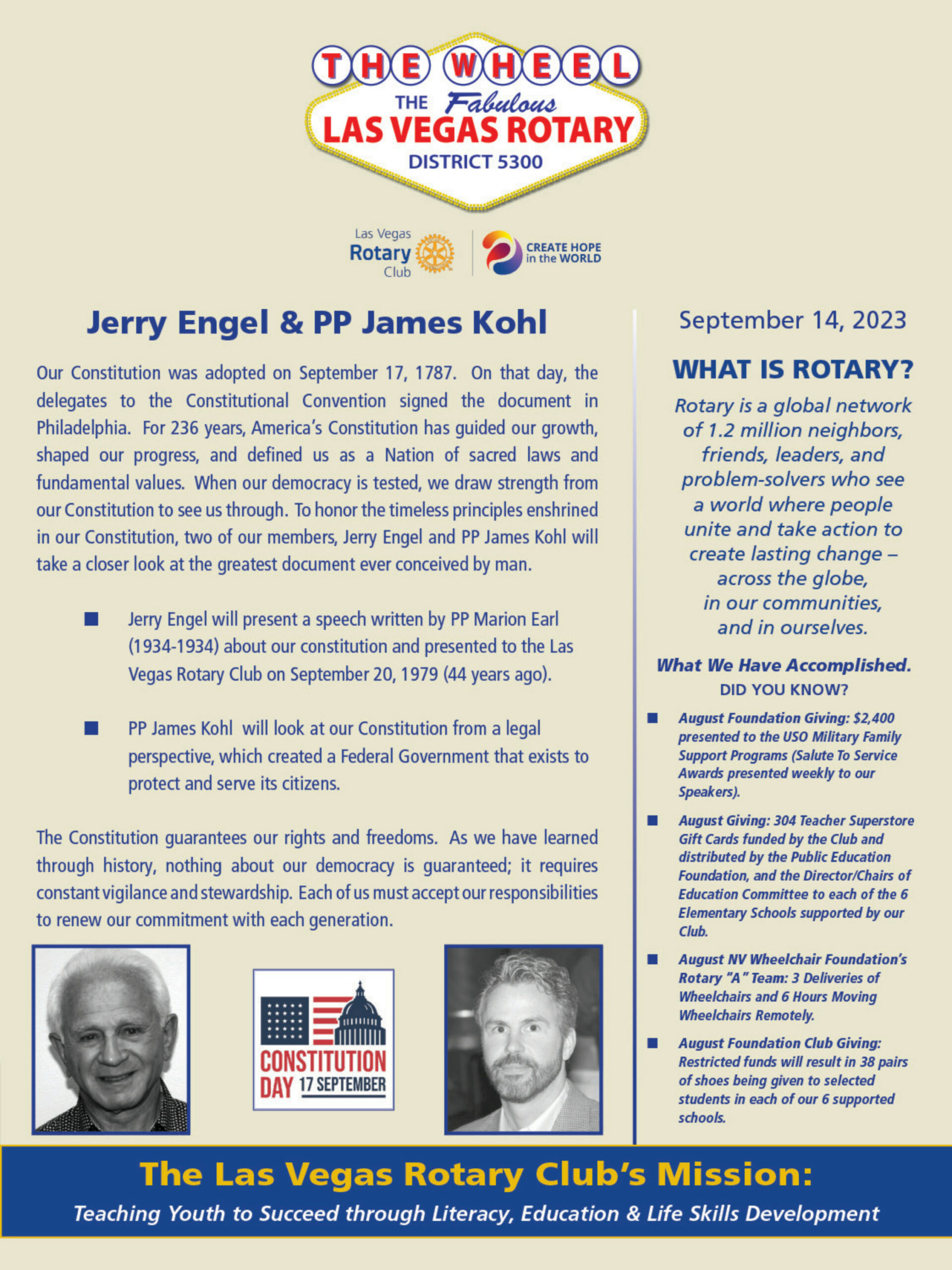 The Wheel for September 14, 2023 by Las Vegas Rotary ClubSep 14, 2023The Wheel0 comments The Wheel Download ← Previous Week Following Week → Submit a Comment Cancel replyYour email address will not be published. Required fields are marked *Comment * Name * Email * Website