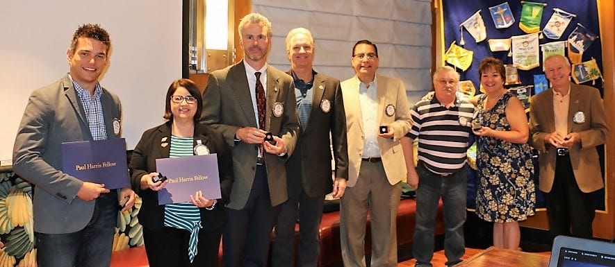 - PE Jackie Thornhill presented pins and certificates to Paul Fellow recipients Erik Astramecki and Ana Orellano – their first PHF, Kirk Alexander +1; Anil Melnick +2, Bruce Frazee +2, Steve Dixon +5, Deb Granda +5, and Jim Kohl +6, with special PHF issued by President Jim to his wife, Judith and Kirk Holmes to his best half Becca