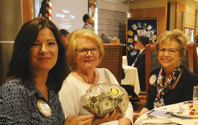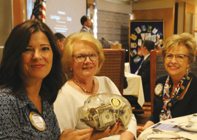 Past Presidents Ginger Anderson and Caty Crockett “Pass-the-Pig” with Carolyn Sparks to help End Polio Now.