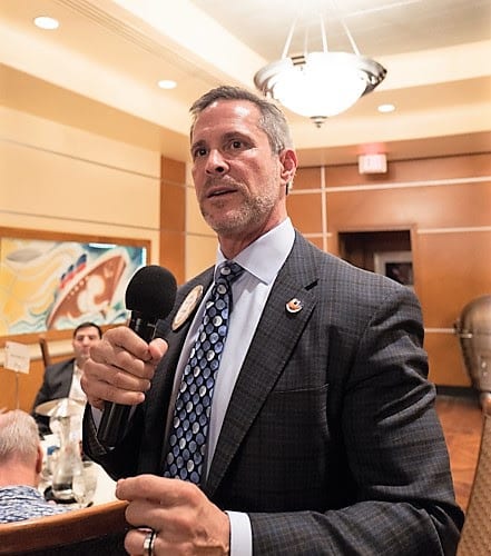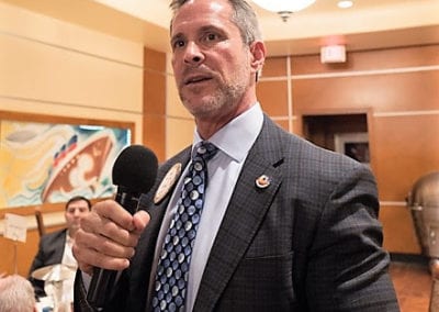 - Caty Crockett introduced our speaker, Mark Hall-Patton, Museum Administrator for the Clark County museum system (running three museums in the general Southern Nevada area). Mark, wearing his wide-brimmed hat, explained how the Aviation Museum at McCarran Airport, is unique insofar as it is not in a separate building with conventional days and hours of operation, but rather throughout the airport in a place where people are, open for viewing 24/7. He shared how PP Caty Crockett’s father was instrumental in the search for land and construction of the airport. While always considering himself a ‘museum administrator’ Mark has found his ‘celebrity’ by his involvement in the TV show “Pawn Stars”, as the ‘man who won’t give a price’.