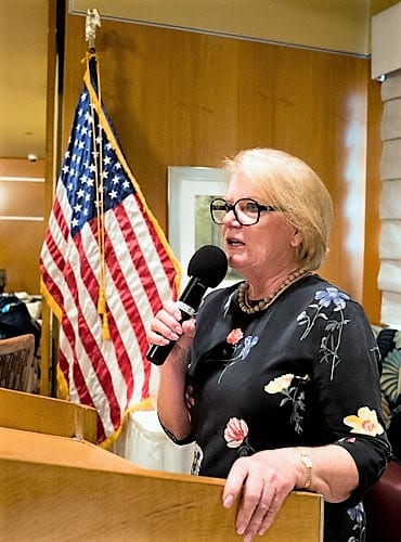 PP Caty Crockett introduces our speaker Mark Hall-Patton. Her family and their land was instrumental in the development of McCarran Airport.