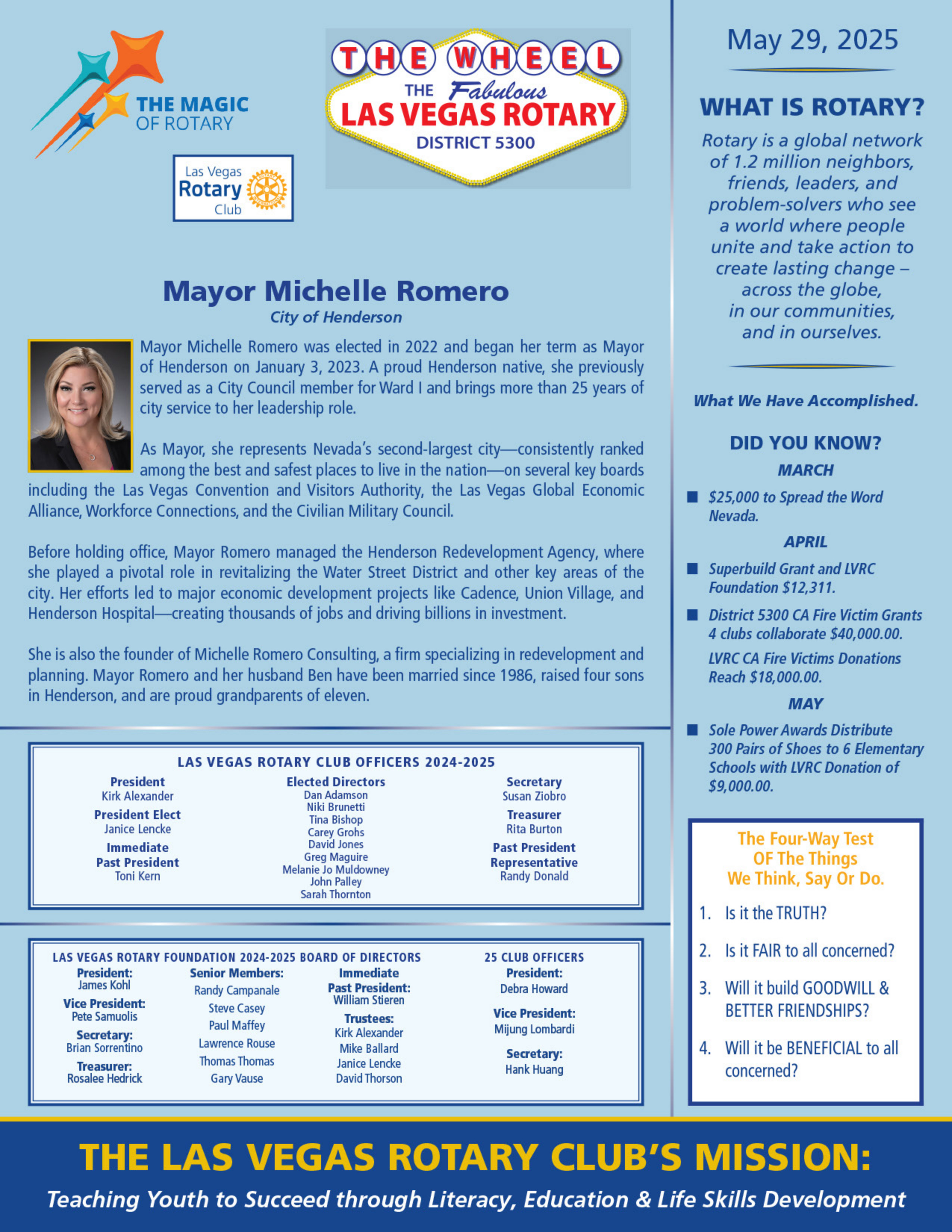 The Wheel for May 29, 2025 by Las Vegas Rotary ClubMay 29, 2025The Wheel0 comments The Wheel Download ← Previous Week Following Week → Submit a Comment Cancel replyYour email address will not be published. Required fields are marked *Comment * Name * Email * Website